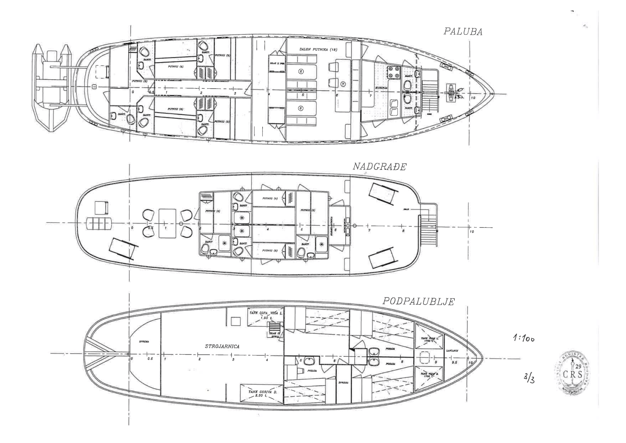Navigacija: 2 gps plotera, Kompas, Radar, VHF radio stanica
